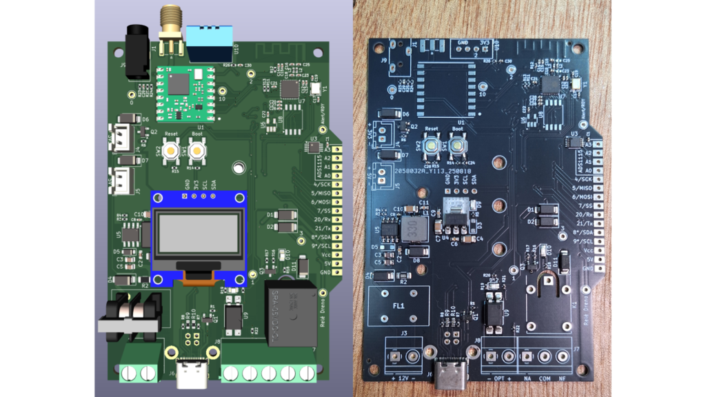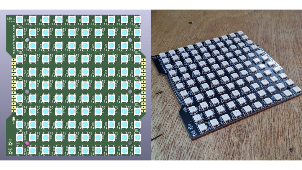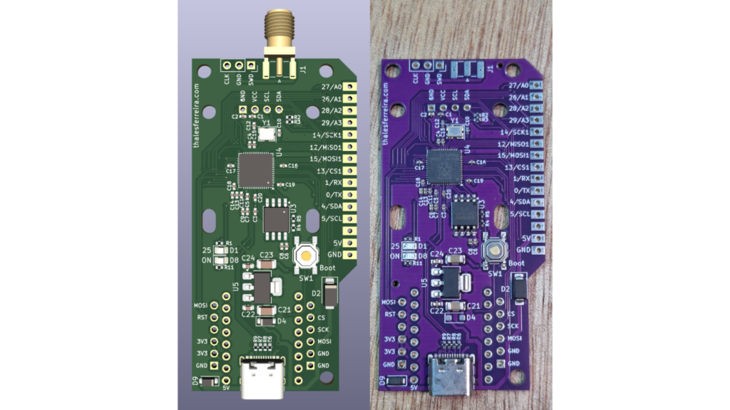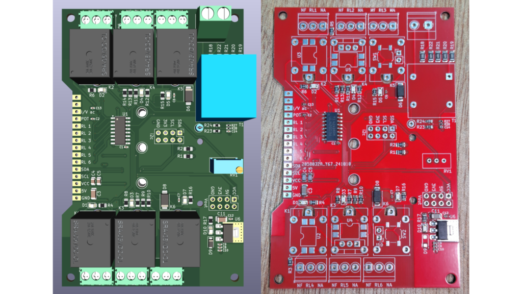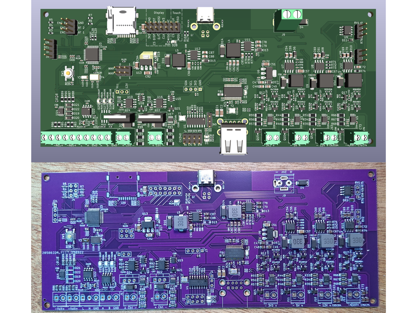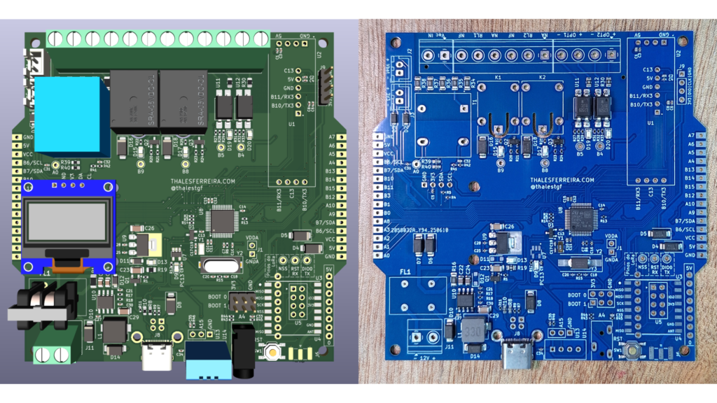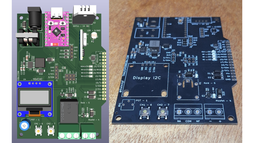 Para cada placa será apresentada uma imagem 3D do projeto junto com uma foto de como eu recebi o produto final. Vale ressaltar que, para reduzir custos, normalmente solicito a fabricação apenas com os componentes SMD soldados e finalizo eu mesmo a montagem dos PTH.